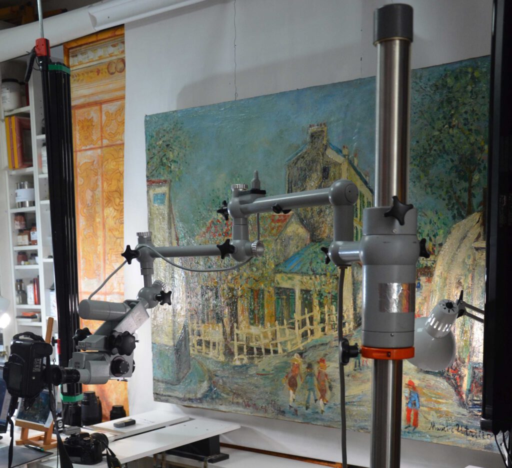 Anfertigung einer Dokumentation zum Vorzustandes, vor, während, nach der Untersuchung, Befundung, Schadenskartierung vom Vorzustand vor der Konservierung, Restaurierung des Gemäldes. Von vermutich Maurice Utrillo,Paris, 1883-1955. Der Dokumentation, Digital, Analoge Fotografie, Digital Videos und weiterführenden Analysen. Nach Notwendigkeit.